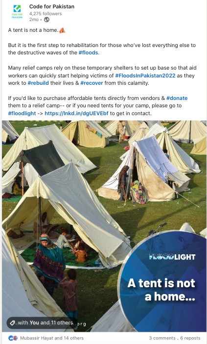 But it wasn’t just about the data, although whatever we managed to gather was quite valuable. It was about making a meaningful difference. And as we tried to do this, we came across new ways that we could contribute that we hadn’t even thought of before. For instance, the time when we reached out to Telenor on Twitter and asked them if they could provide support to Madat Balochistan, a grassroots NGO that we were in contact with. This organization was working tirelessly in one of the areas most severely affected by the floods, and their on-the-ground volunteers were struggling to coordinate aid activities due to damaged telecom lines. Not long after our tweet, Telenor came through with multiple WiFi devices for Madat Balochistan to continue their aid work more effectively!
